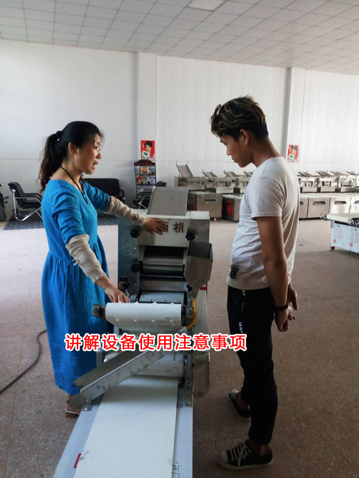 阜陽客戶張先生前來考察手撕面機,經常接待人員詳細講解??蛻舳ㄙ忞p輥單刀燴面機設備。當天定機,當天調試學習!注:阜陽手撕面就是河南燴面坯,只是叫法不同!