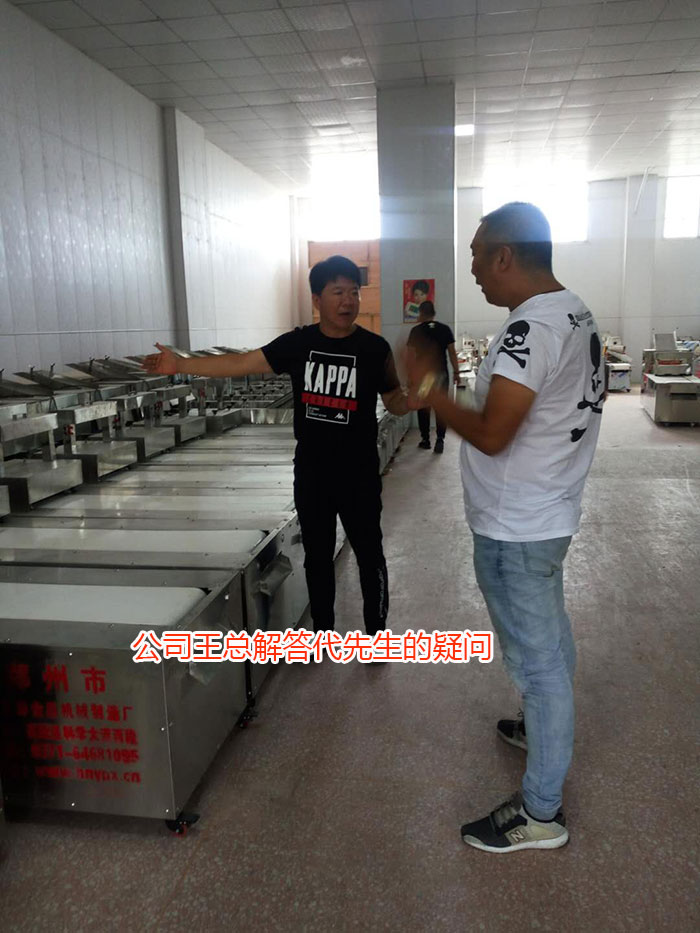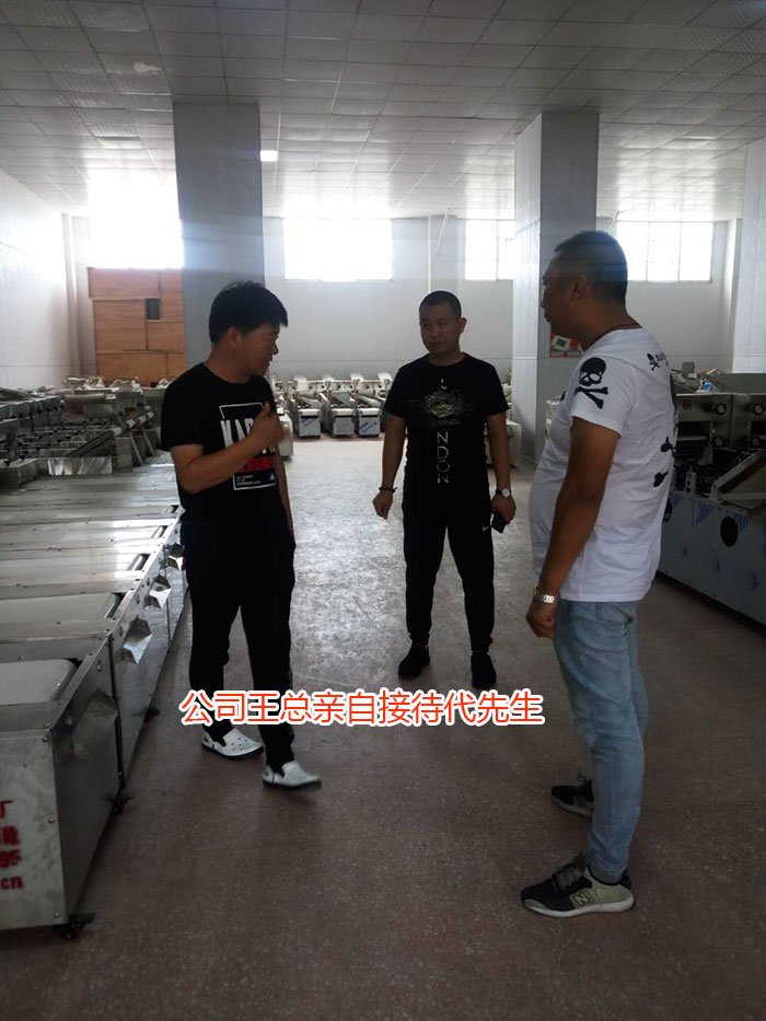 在直營批發(fā)店和工廠,王總詳細為代先生介紹了新型9代多功能設備的研發(fā)由來、產(chǎn)品優(yōu)勢、生產(chǎn)品種、維護保養(yǎng)等,并現(xiàn)場進行了生產(chǎn)實驗。代先生經(jīng)過現(xiàn)場參觀、咨詢、品嘗,結合自己的實際情況。當即定購了一臺特殊定制款新款9代多功能成型機設備(可自動刷油+自動撒淀粉+機身加長+特殊刀具尺寸等)和一臺500型加厚款全自動揉壓機。