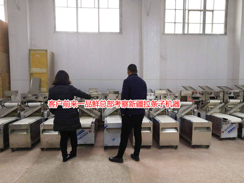 漯河客戶在新疆承包土地種棉花,閑時(shí)在當(dāng)?shù)剞r(nóng)貿(mào)市場轉(zhuǎn)轉(zhuǎn),發(fā)現(xiàn)當(dāng)?shù)氐男陆瓧l子都是手工做,沒有人專門做好去批發(fā)??蛻舭l(fā)現(xiàn)這個(gè)商機(jī)后,就在網(wǎng)上查詢能生產(chǎn)拉條子 的機(jī)器。在了解到一品鮮多功能設(shè)備可以生產(chǎn)拉條子,扯面,拉面等多種面食后,前來總部進(jìn)行現(xiàn)場考察。